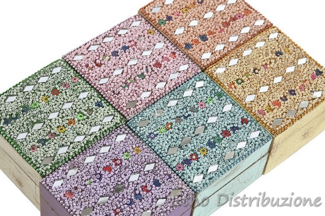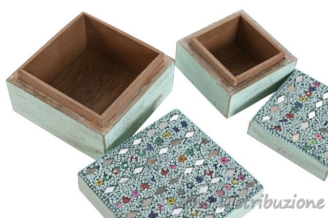 JO-212442 – Set 2 portagioie quadrati in legno di mango con coperchio lavorato con perline