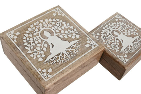 LD-212806 – Set di 2 scatole in legno di Mango lavorate a mano con raffigurato Buddha con Albero della Vita